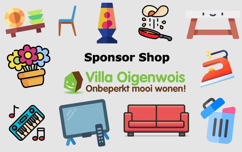 Voor de inrichting van Villa Oigenwois zijn veel, heel veel, spullen en dus geld nodig! De benodigde spullen kunt u terugvinden in onze Sponsor Shop.